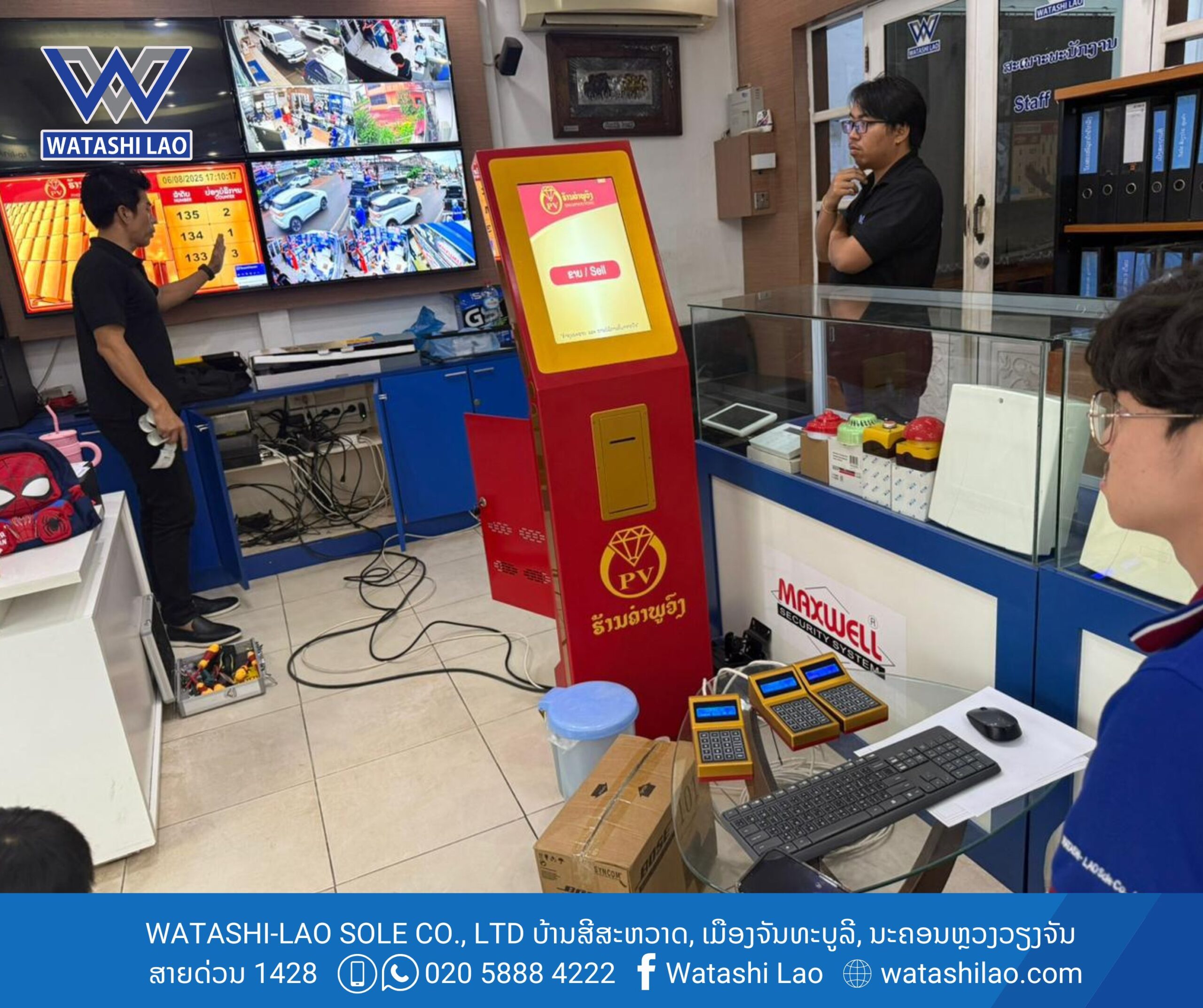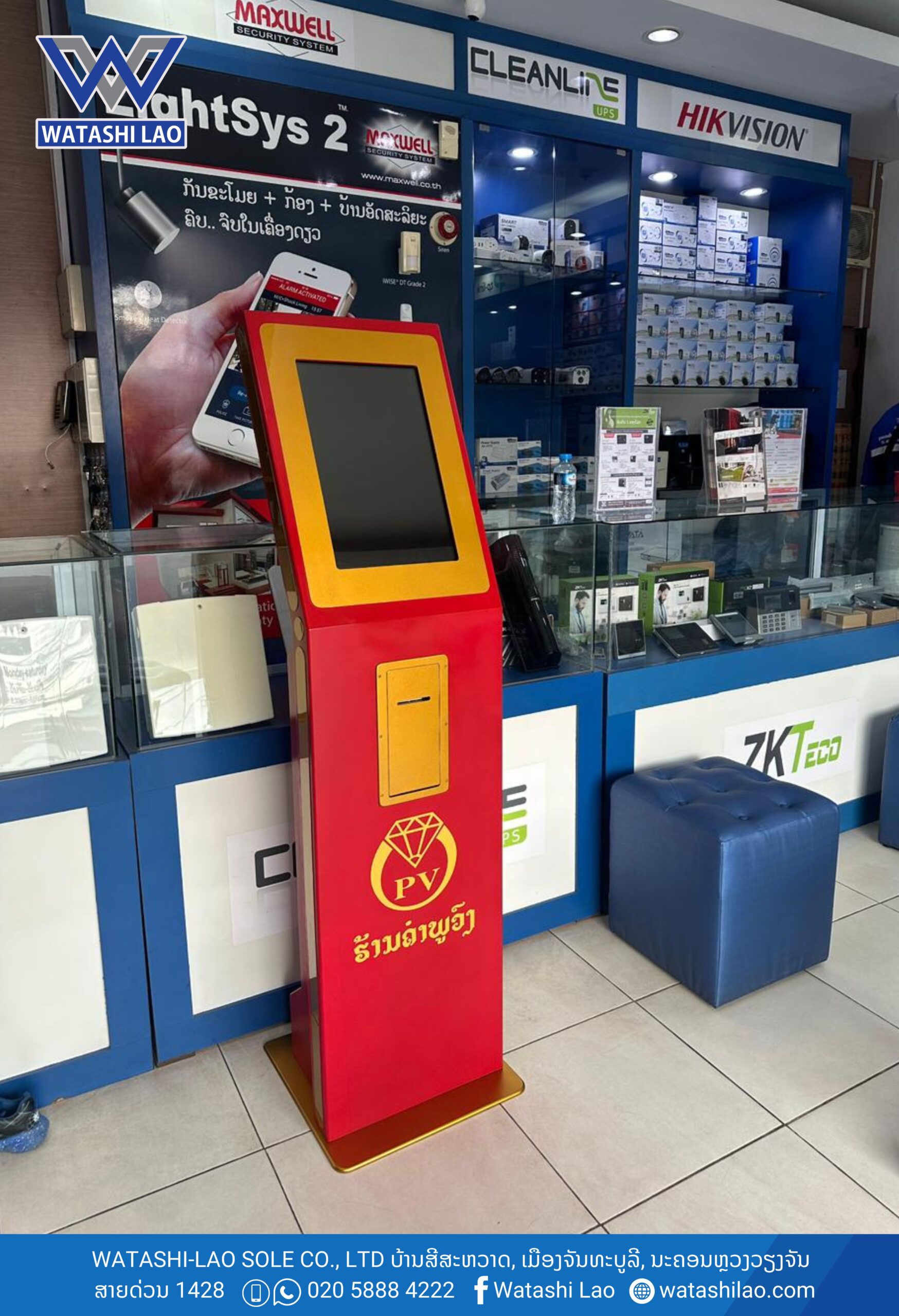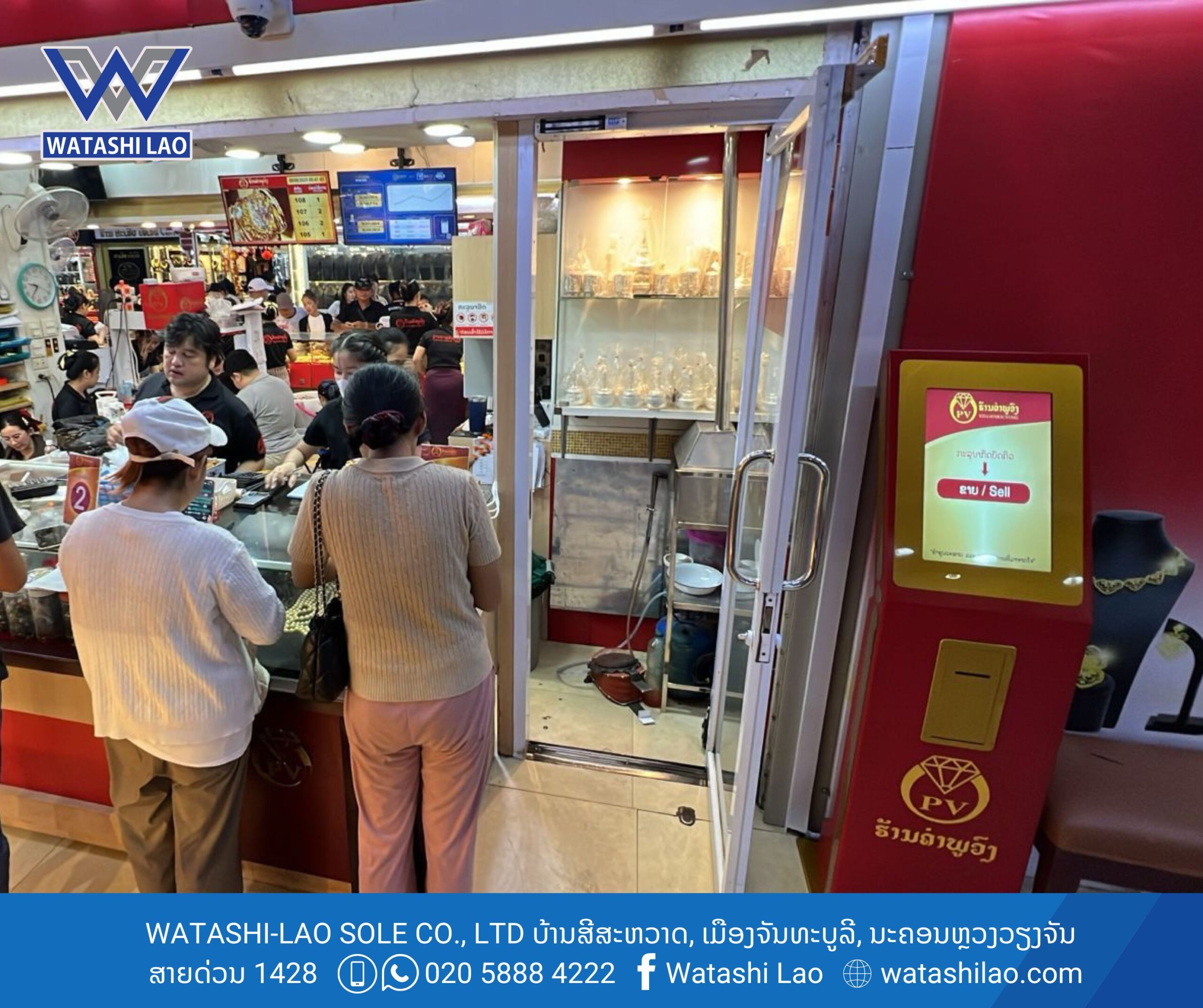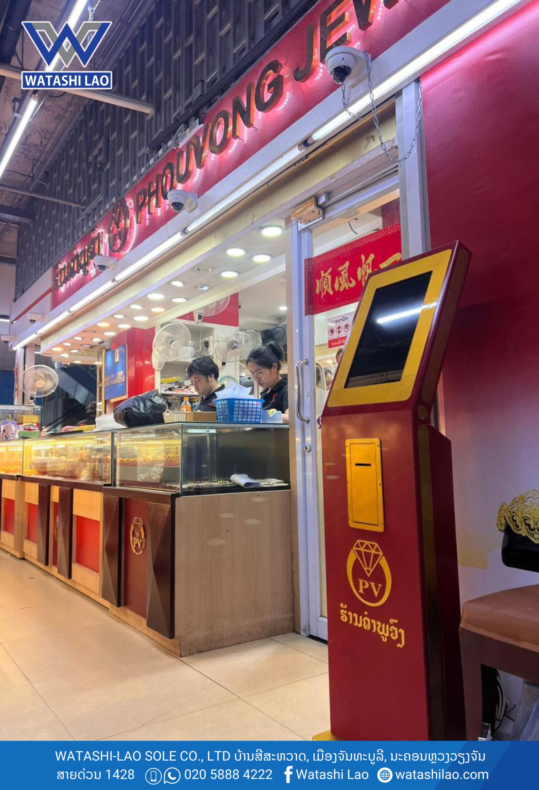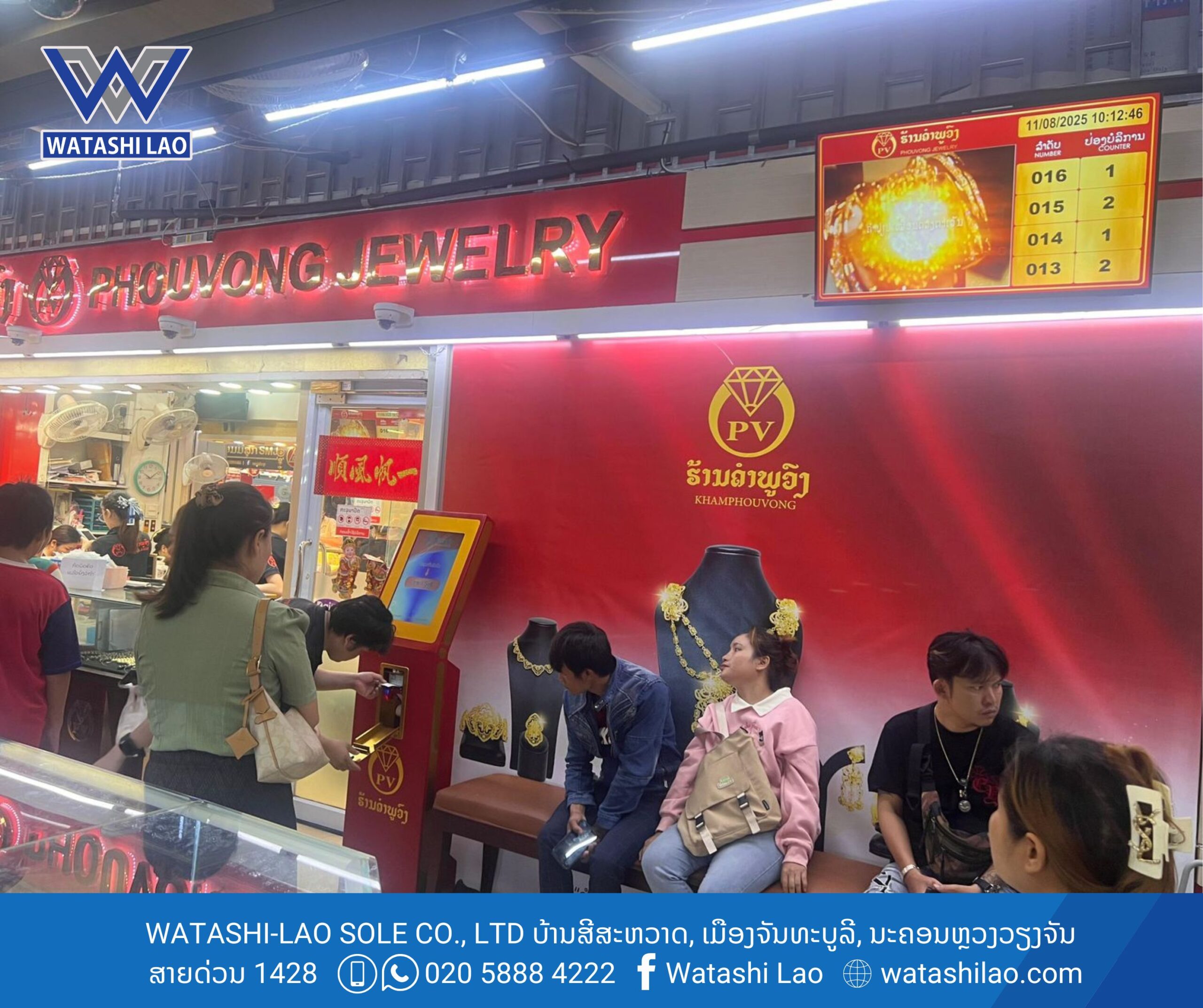 #ຮ້ານຄຳພູວົງ ໄດ້ນຳໃຊ້ລະບົບ Smart Queue Management System ຈາກ #ວາຕາຊິລາວ ໂດຍມີເຄື່ອງກົດບັດຄິວ ແບບສຳພັດໜ້າຈໍ Queue Controller ຈຳນວນ 1 ຊຸດ (ສາມາດປັບແຕ່ງສີໄດ້ຕາມສີຂອງທຸລະກິດທ່ານ), ເຄື່ອງເອີ້ນຄິວແບບປຸ່ມກົດ Key-Touch, ແລະ ໄດ້ມີການເຊື່ອລະບົບເຂົ້າຈໍສະແດງຄິວ Queue Display.